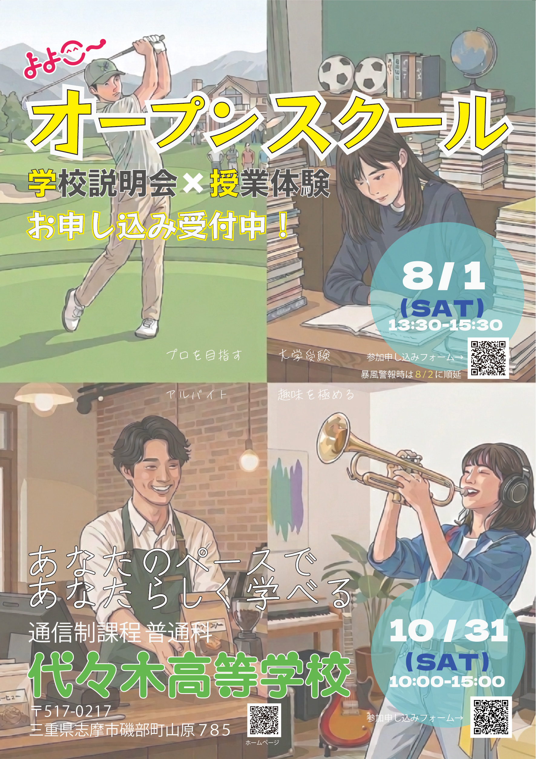 2026年度のオープンスクール開催のご案内 お申し込みはQRコードからどうぞ。 ▪️夏のオープンスクール 8月1日(土) 13:30-15:30 三重県志摩市磯部町山原785(代々木高校本校) 通信制高校の模擬授業を体験してみよう! ▪️秋のオープンスクール(文化祭) 10月31日(土)10:00-15:00 三重県志摩市磯部町山原785(代々木高校本校) 文化祭のイベントで活躍する先輩の活躍を見にきてね。