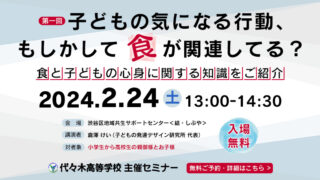 イベント 代々木高校主催セミナー(無料)「子どもの気になる行動、もしかして食が関連している?」 代々木高校東京本部が主催する第1回「子どもの気になる行動、もしかして食が関連している?」のセミナー(無料)を開催いたします。日時 2024年2月24日(土) 13:00~14:30場所 渋谷区地域共生サポートセンター〈結・しぶや〉※渋谷区... 2024.02.13 イベント