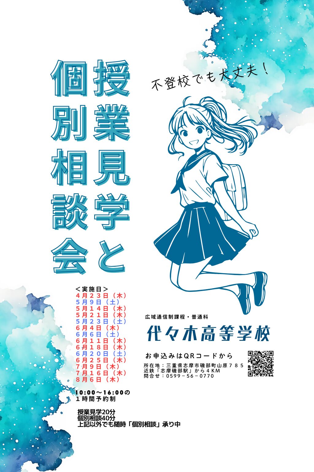 代々木高校では、スクーリング(授業)の見学会と個別相談会をこの日程で行なっています。この日程以外でも随時相談会を受け付けています。お申し込みはQRコードまたはこちらからどうぞ。