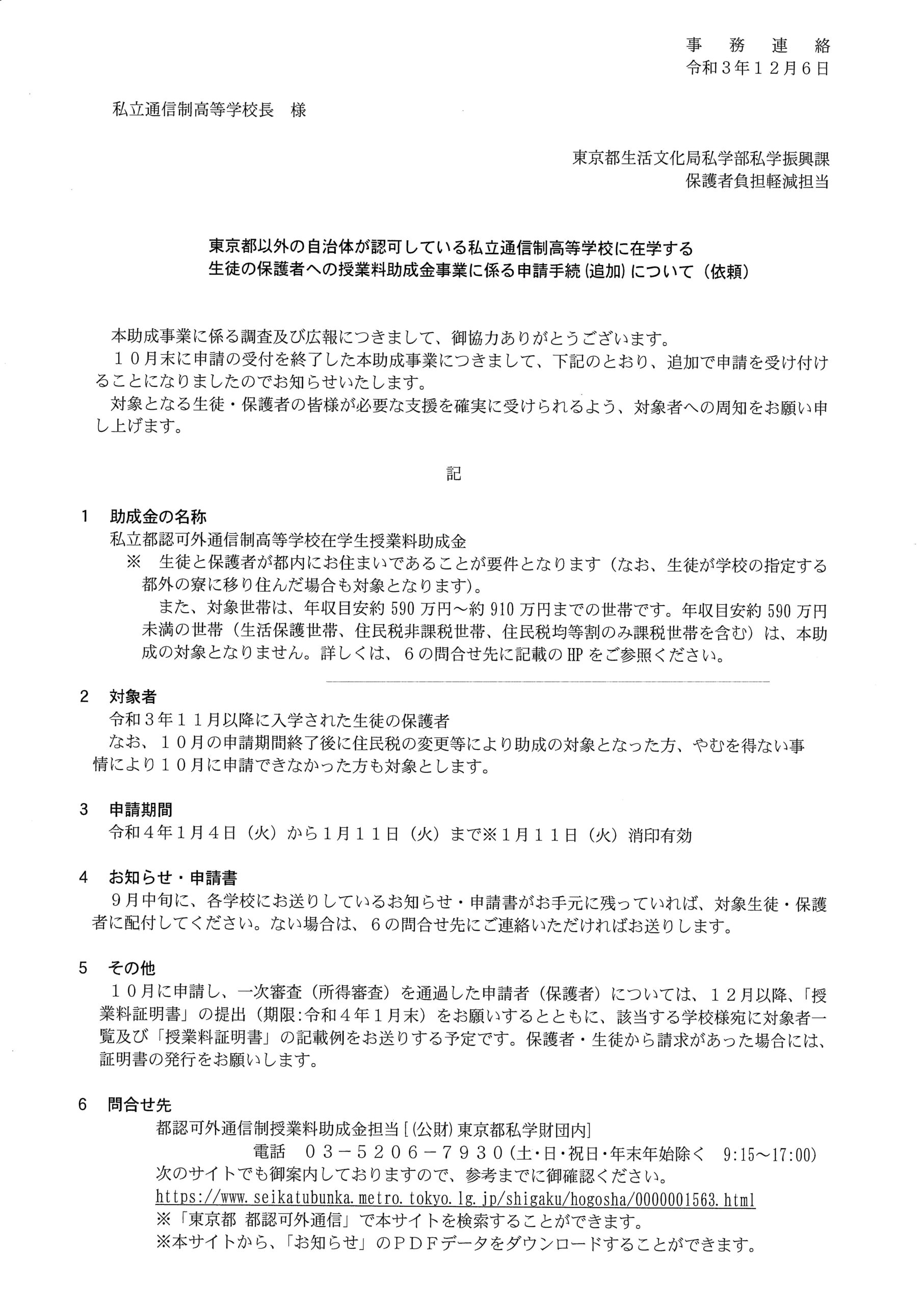 2021.12.09 東京都以外の自治体が許可している私立通信制高等学校に在学する 生徒の保護者への授業料助成金事業に係る申請手続(追加)について(依頼) 東京都以外の自治体が許可している私立通信制高等学校に在学する 生徒の保護者への授業料助成金事業に係る申請手続(追加)について(依頼) 助成金の名称 私立都認可外通信制高等学校在学生授業助成金 対象者 令和3年11月以降に入学された生徒の保護者 申請期間 令和4年1月4日(火)から1月11日(火)まで※1月11日(火)消印有効 問合せ先 都認可外通信制授業料助成担当[(公財)東京都私学財団内] 電話 03ー5206ー7930(土・日・祝日・年末年始除く 9:15~17:00)