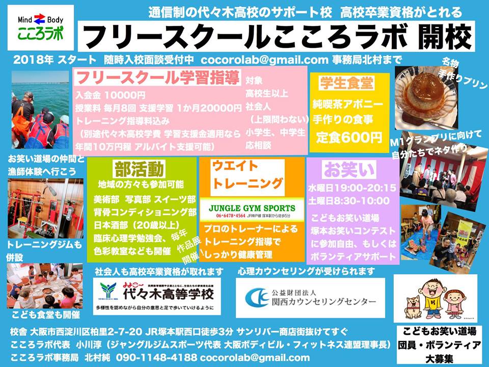 - 大阪ならではのお笑いを学び、パーソナルトレーニングを通して健康を学び、様々なボランティア活動体験して、立派な社会人として成長を目指します。